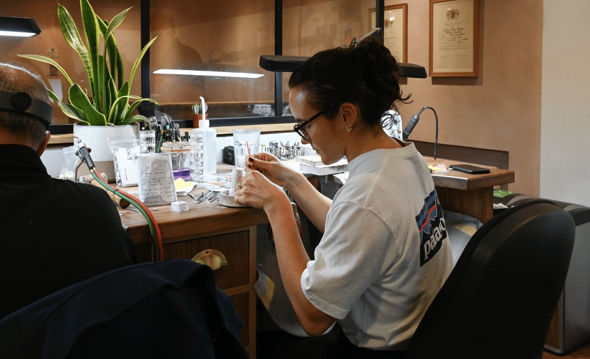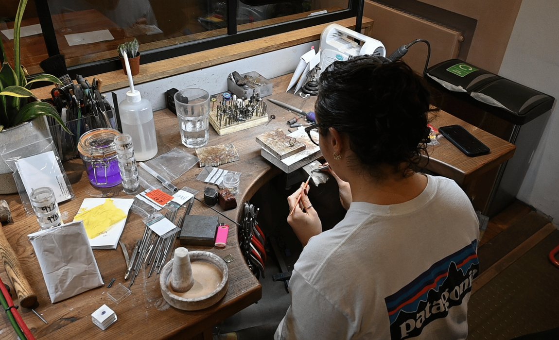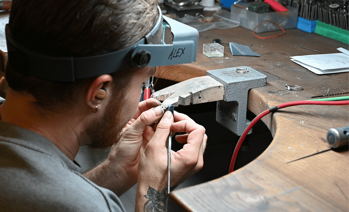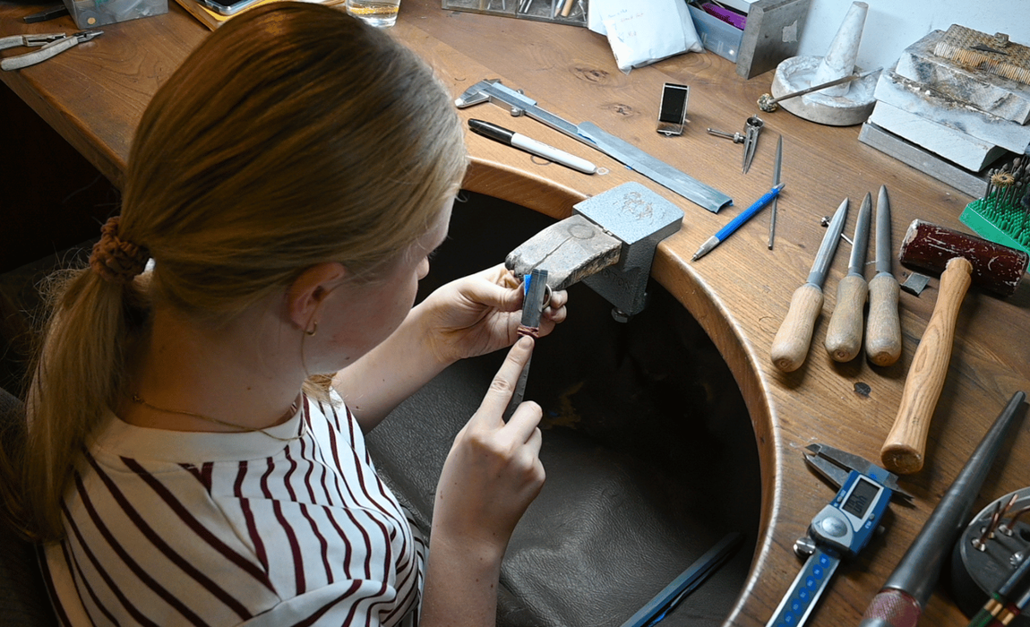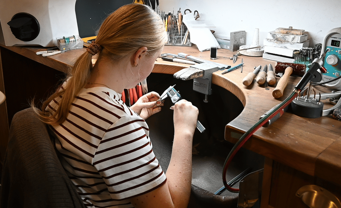 My current apprentice, Gemma, is the third apprentice I’ve taken on. Apprenticeships are a path I deeply understand, having been an apprentice myself. It’s a rewarding process that allows us to nurture talent and teach skills that aren’t easily accessible elsewhere. After completing the Jewellery Foundation Programme, individuals have basic skills but remain open to learning. This balance is crucial, as it ensures they’re teachable while still bringing some knowledge to the table.
