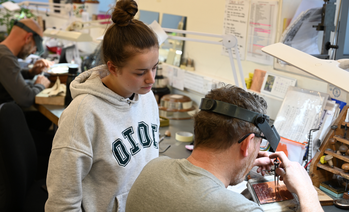 Some of the postgraduates we’ve worked with have even gone on to receive QEST (Queen Elizabeth Scholarship Trust) funding to train with us, and being in the same building makes it easy to stay in touch. Our aim was never to turn students into engravers, but to show them how engraving can be integrated into their own practice, even if they never pick up a graver again. We wanted to expand their thinking: to show that engraving isn’t just about pictures or lettering. It’s a practical tool. For example, gravers can be used for filing, cleaning up, or finishing work in ways many hadn’t considered.