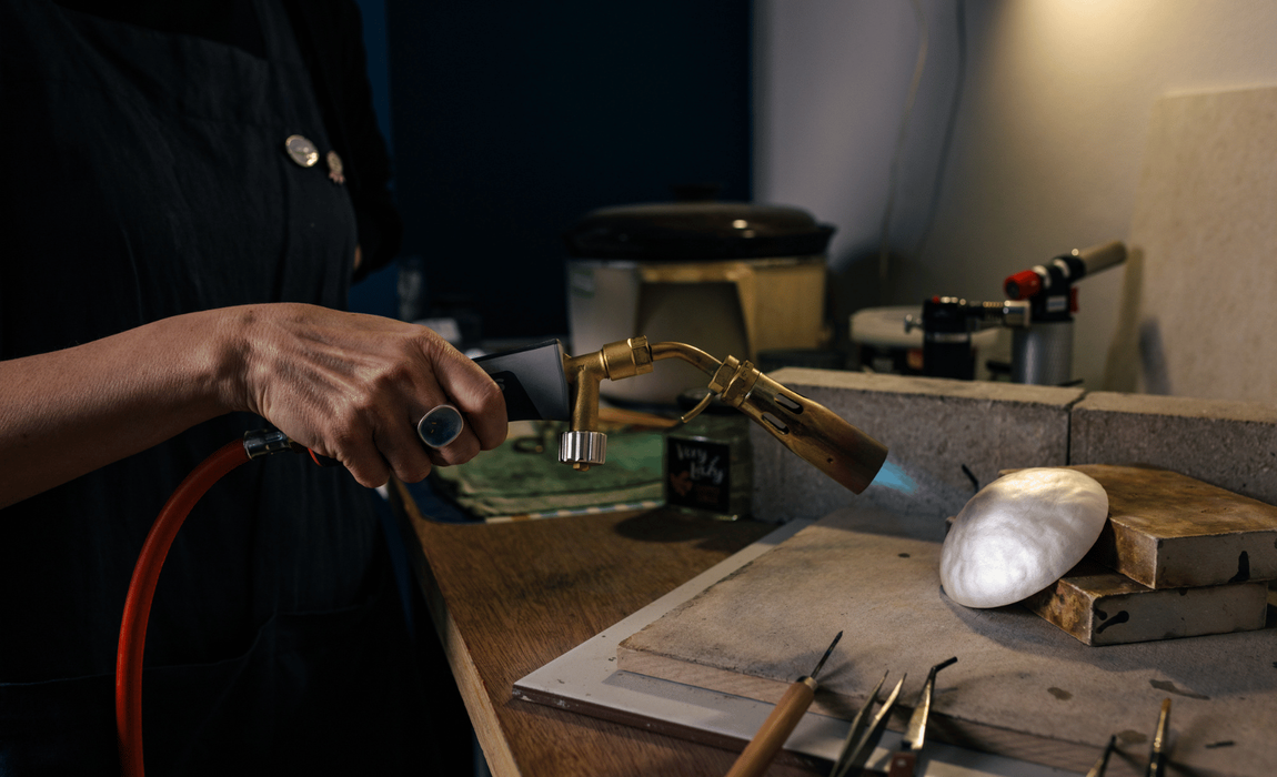 The process of enamelling is one of patience, precision, and quiet transformation. Each piece begins with a bare metal canvas - silver, copper, or gold - carefully cleaned to remove every trace of dust or grease. Fine enamel powder, moistened into a paste, is then applied with care, settling into place before the piece enters the intense heat of the kiln. In moments, the powder melts, its colours blooming into a smooth, glassy skin. Layer by layer, the process builds: creating depth, complexity, and quiet beauty.